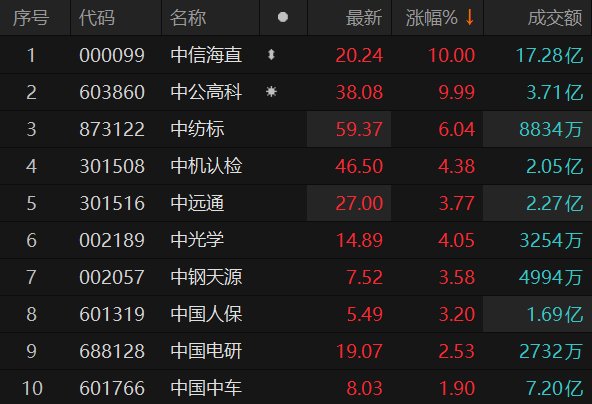 上证报中国证券网讯 4月18日,“中字头”个股探底回升,截至9时43分,中公高科4连板,中信海直2连板,中国人保、中国联通等跟涨。