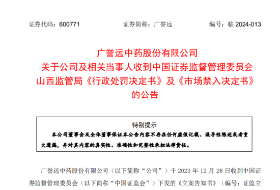 4月10日,山西老字号药企广誉远发布公告称,公司及相关当事人收到山西证监局下发的《行政处罚决定书》及《市场禁入决定书》。