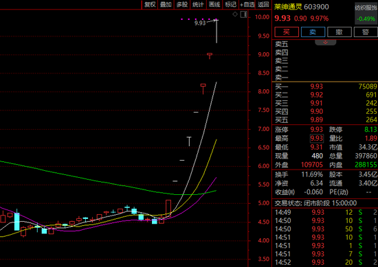 截至4月11日收盘,莱绅通灵已经八连板,股价站上9.93元,最新市值34.27亿元。