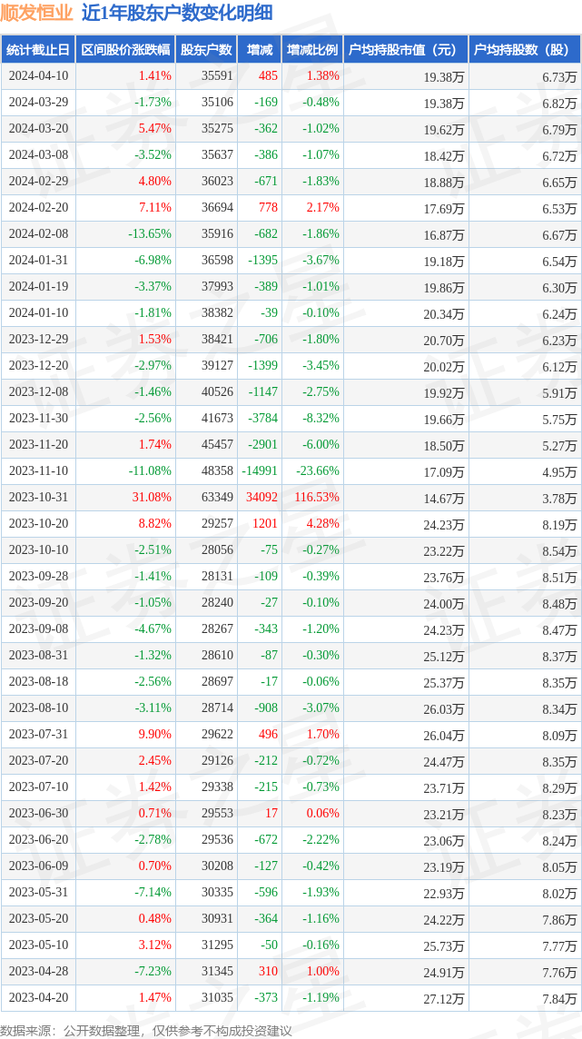 从股价来看,2024年3月29日至2024年4月10日,顺发恒业区间涨幅为1.41%,在此期间股东户数增加485.0户,增幅为1.38%。