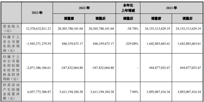 挖贝网4月11日,金融街 近日发布2023年年度报告,报告期内公司实现营业收入12,570,632,811.21元,同比下滑38.70%;归属于上市公司股东的净利润-1,945,571,279.59元,较上年同期由盈转亏。