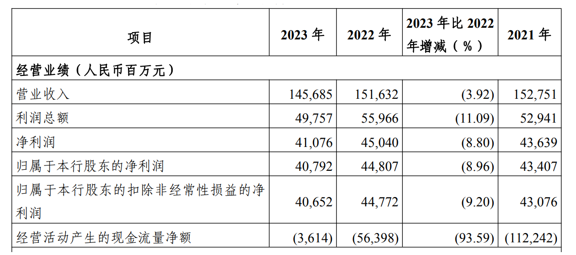 2023年,光大银行实现营业收入1,456.85亿元,同比下降3.92%。其中,利息净收入1,074.80亿元,同比下降5.43%;手续费及佣金净收入236.98亿元,同比下降11.39%。
