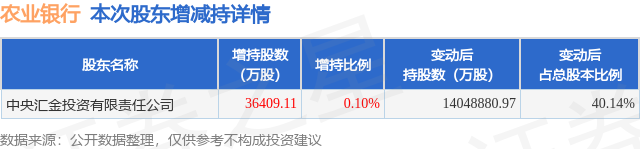 4月12日农业银行发布公告,其股东增持36409.1万股