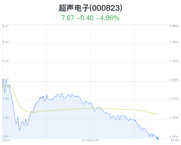 04月15日,超声电子(000823)股价大幅下跌,截至14点31分,超声电子下跌5.08%,报7.66元/股,创近1月新低,成交7266万元,换手率1.73%。