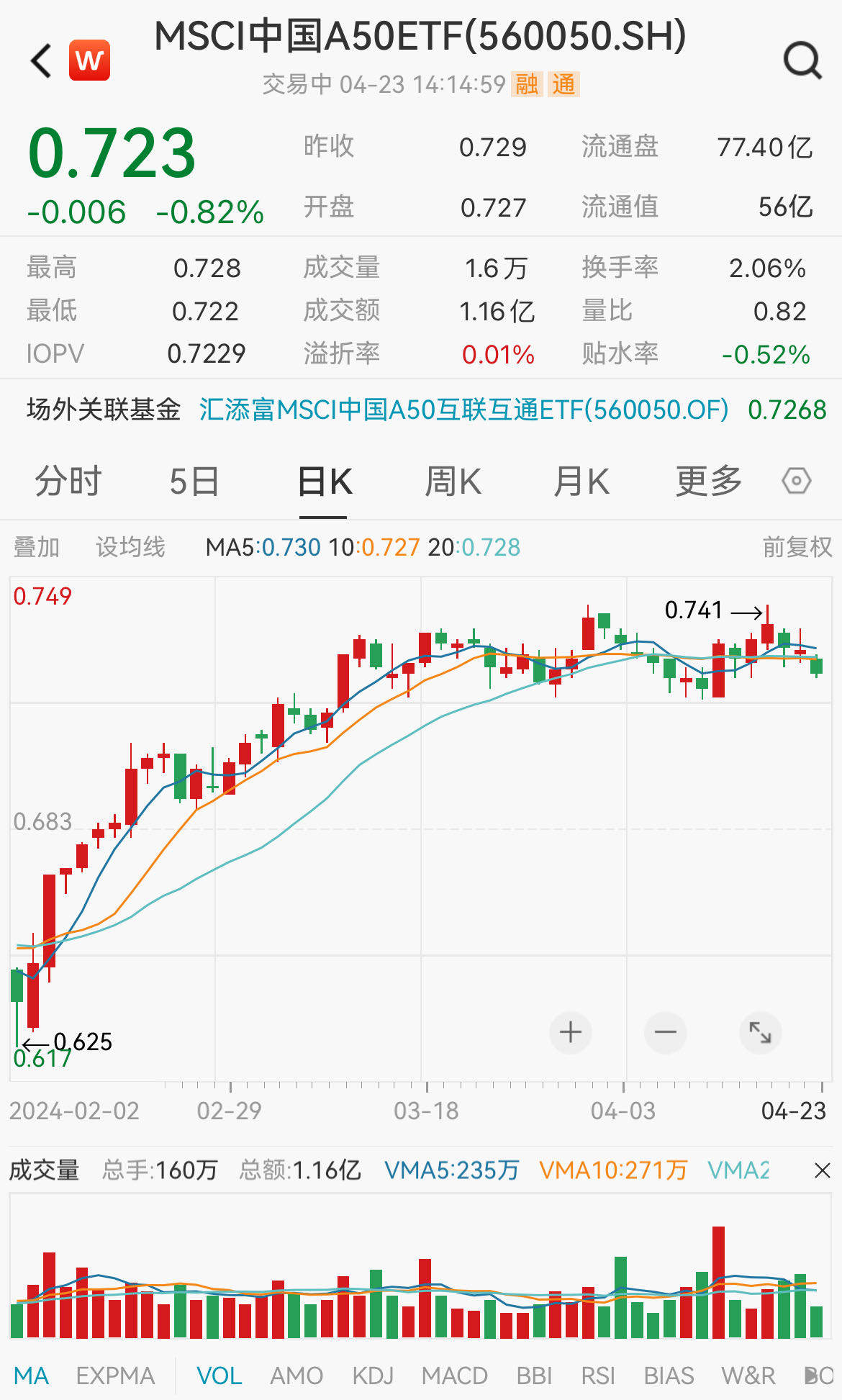 截至2024年4月23日 14:14,MSCI中国A50ETF下跌0.82%,最新报价0.72元,盘中成交额已达1.16亿元,换手率2.06%,该基金昨日逆市吸金近5000万元!跟踪指数成份股恒瑞医药领涨超5%,山西汾酒、迈瑞医疗、五粮液、泸州老窖、立讯精密、洋河股份、药明康德等个股跟涨,紫金矿业、中国石油领跌蓝筹。