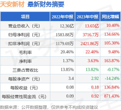 天安新材(603725)2023年中报简析:营收净利润双双增长,债务压力大