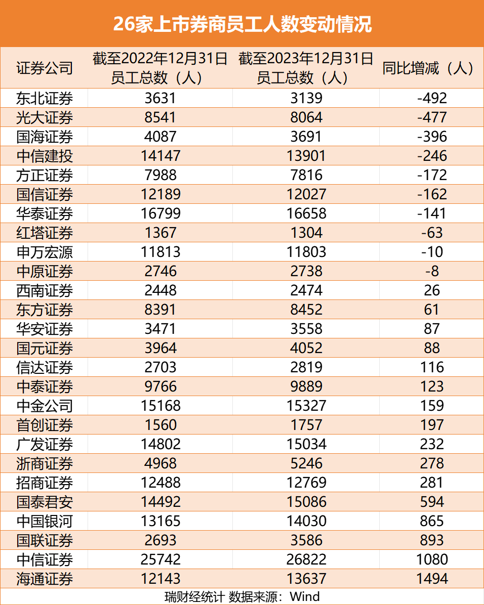 2023券商员工人数变动榜:四成减员,中信证券业绩下滑仍增员超千人