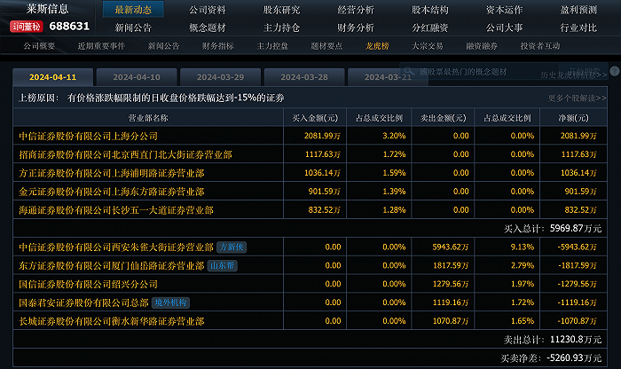 继4月10日实力游资方新侠所在的中信证券西安朱雀大街营业部大肆买入莱斯信息(688631.SH)、宗申动力(001696.SZ)、中信海直(000099.SZ)之后,一夜之间,又在4月11日成为莱斯信息、宗申动力、深城交(301091.SZ)的最大出货人。