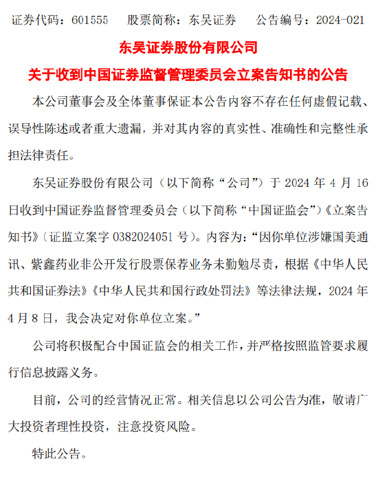 东吴证券公告,因公司涉嫌国美通讯、紫鑫药业非公开发行股票保荐业务未勤勉尽责,收到证监会立案告知书。