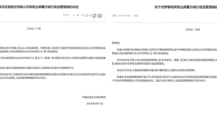 同时,对于中国银河存在开展股票质押业务不审慎的情况,公司时任分管上述业务的高管罗黎明负有责任,同样被出具警示函。