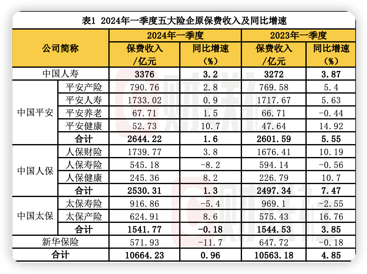 A股五大险企一季度保费出炉:财险老三家增速同比收窄 人身险两升三降 新华保险延续两位数负增