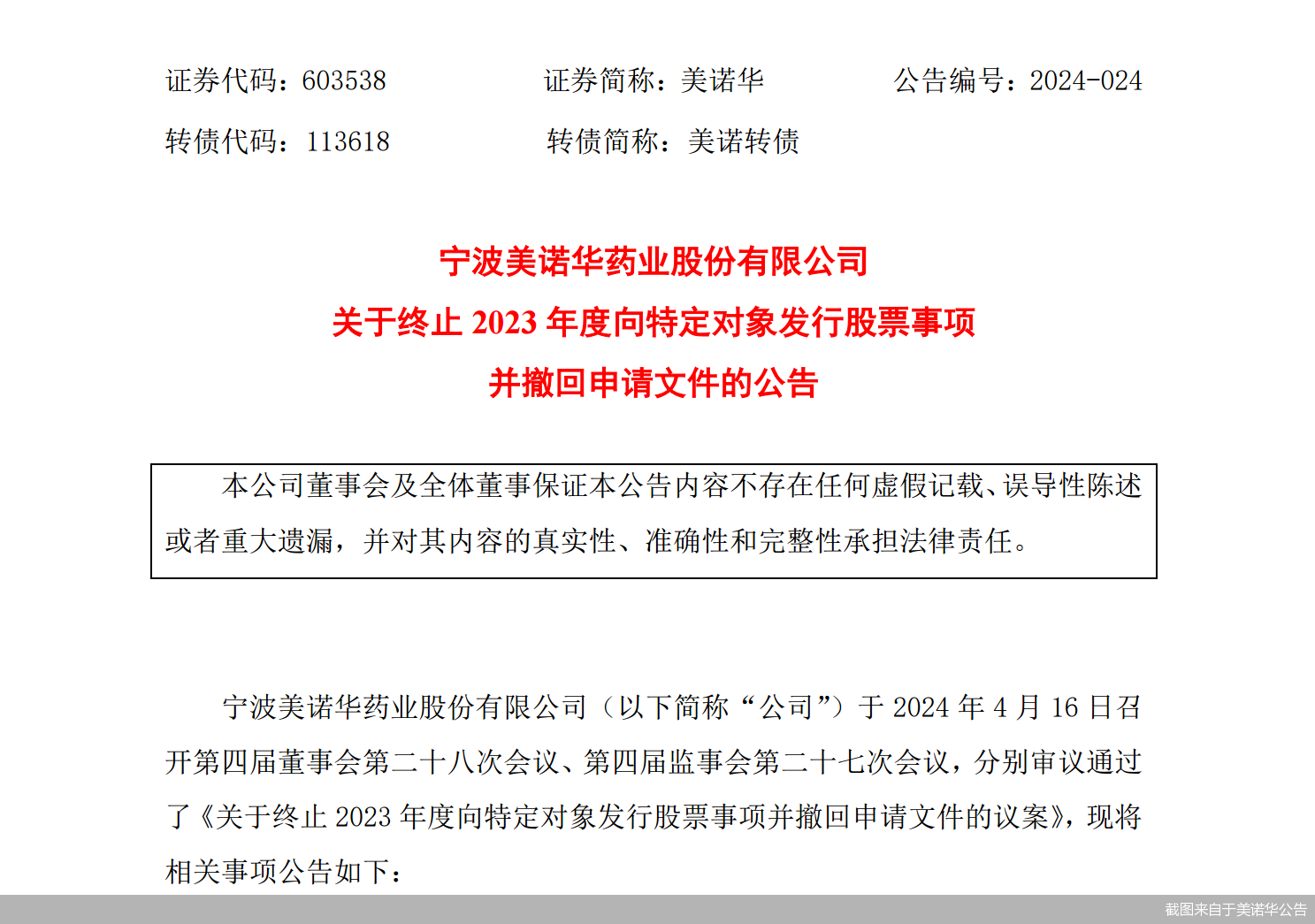 筹划近9个月,上述定增宣告终止。美诺华表示,综合考虑当前宏观、微观环境和市场情况变化以及公司发展规划等诸多因素,经相关各方充分沟通、审慎分析后,公司决定终止2023年度向特定对象发行股票事项,并向上交所申请撤回相关申请文件。