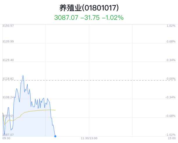 04月19日,养殖业行业盘中跳水,截至10点44分,养殖业行业整体指数下跌1.02%,报3087.070点。