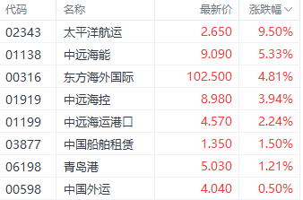 财联社4月19日讯(编辑 胡家荣)伴随着早盘国际金价和油价一度走强,部分港股航运股也出现上涨。截至发稿,太平洋航运(02343.HK)、中远海能(01138.HK)、东方海外国际(00316.HK)分别上涨9.50%、5.33%、4.81%。