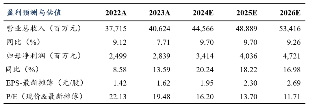 盈利预测与投资评级:考虑到宏观经济环境与行业政策变化,我们将公司2024-2025年归母净利润预测从 35.11/42.16亿元下调至34.14/40.36亿元,预计2026年归母净利润为47.21亿元,对应当前市值的PE估值分别为16/14/12倍。维持“买入”评级。