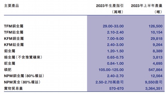 好消息是,2023年4月,公司与刚果(金)国家矿业总公司(Gécamines)就TFM权益金问题达成共识,TFM权益金问题现已解决,TFM铜钴产品顺利恢复出口。截至2023年半年报,公司共累积铜库存24.07万吨,钴库存2.95万吨,受该消息所影响,该库存有望在下半年形成销量释放。由此,公司指引2023年铜钴产能及产量大增,可见对下半年铜钴板块收入及利润有望形成巨大的提振作用,加速业绩的复苏增长。