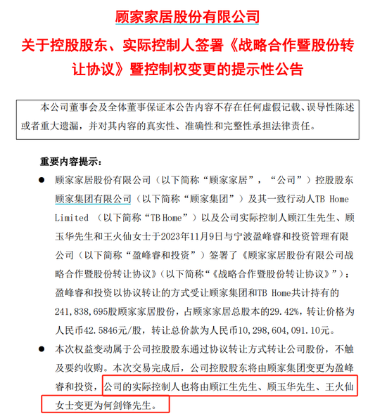 其中,盈峰睿和投资以协议转让的方式受让顾家集团和TB Home共计持有的2.42亿股公司股份,占公司总股本的29.42%,转让价格为42.5846元/股,转让总价款为102.99亿元。