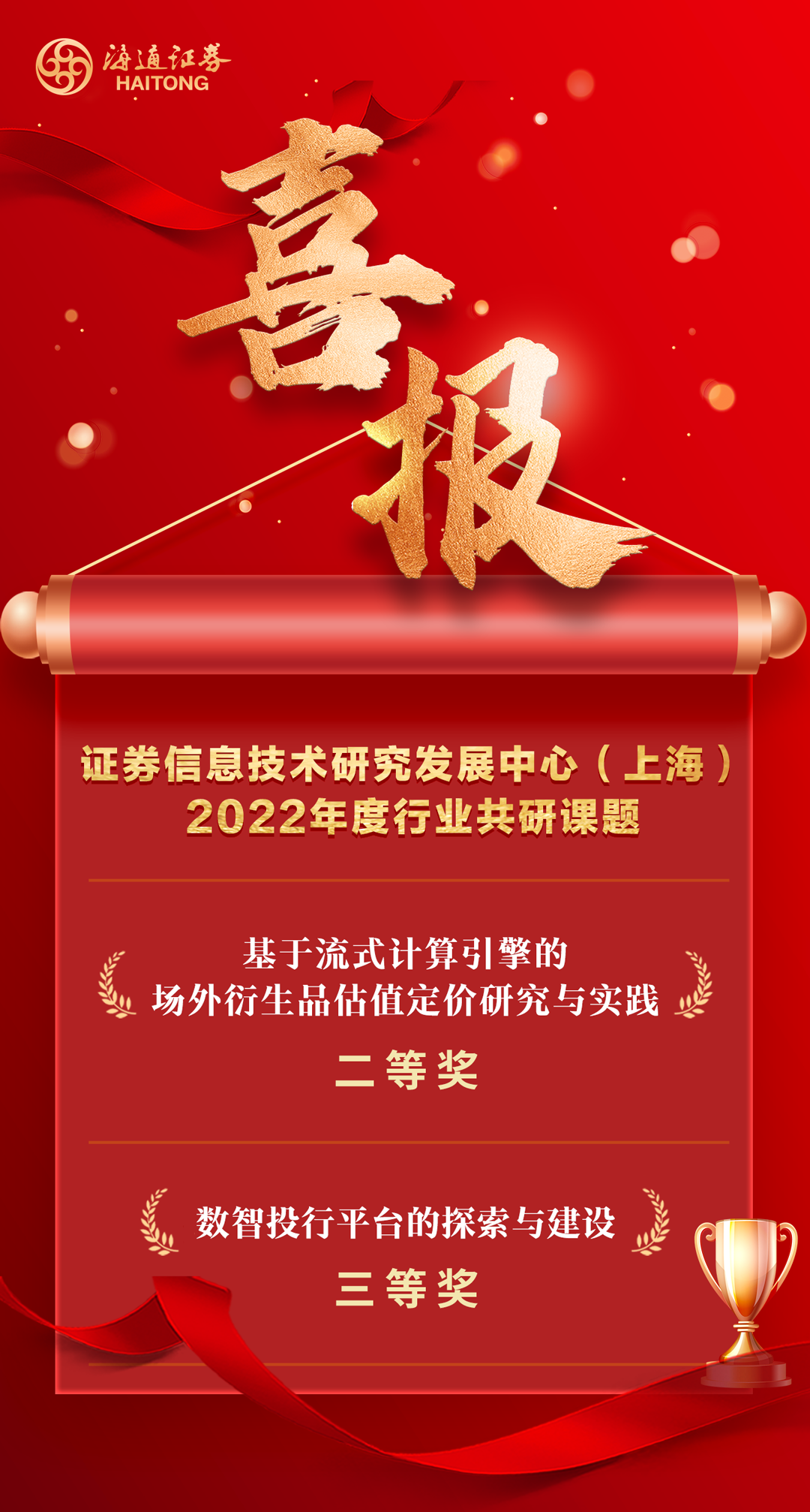 近日,证券信息技术研究发展中心(上海)(以下简称ITRDC)发布2022年度行业共研评审结果,海通证券申报的《基于流式计算引擎的场外衍生品估值定价研究与实践》荣获二等奖,《数智投行平台的探索与建设》荣获三等奖。