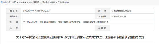 证监局表示,保利联合上述行为违反了《上市公司信息披露管理办法》相关规定,决定对其采取警示函措施。同时,公司董事长刘文生、董事会秘书王丽春,未勤勉尽责被采取监管谈话措施,并记入证券期货市场诚信档案。