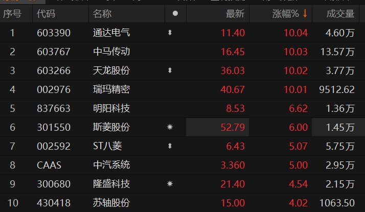 上证报中国证券网讯 11月3日,汽车零部件板块表现活跃,截至9时39分,天龙股份8连板,通达电气3连板,瑞玛精密2连板,中马传动涨停。