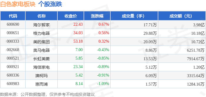 北向资金方面,当日白色家电板块北向资金持股市值为1107.74亿元,增持2.43亿元。其中增持最多的是格力电器,增持了1.54亿元。减持持最多的是奥马电器,减持了225.83万元。白色家电板块北向资金持股变动明细见下表: