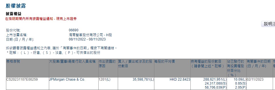 小摩减持海尔智家(06690)约3559.88万股 每股作价约22.84港元
