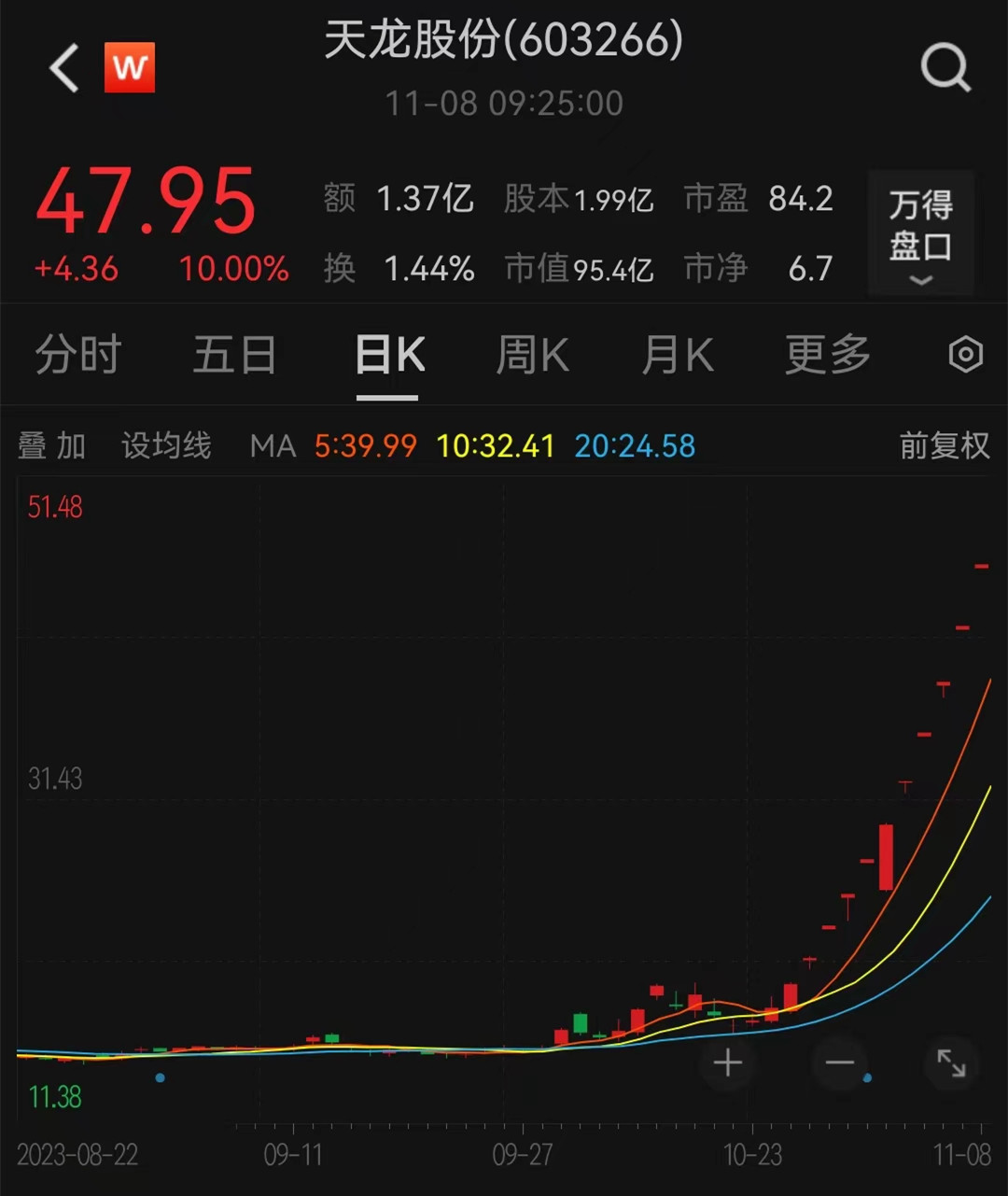 11月8日,天龙股份开盘再度涨停,收获11连板。截至发稿,股价报47.95元。