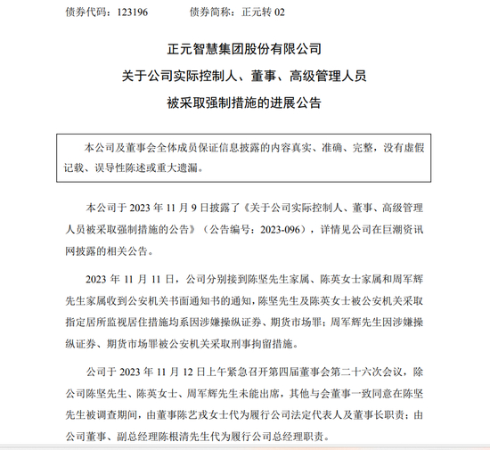 11月9日,正元智慧公告透露,当日收到公司实际控制人、董事长兼总经理陈坚家属的通知,陈坚被公安机关采取指定居所监视居住措施;收到公司董事陈英家属通知,陈英被公安机关采取指定居所监视居住措施;收到公司董事、副总经理兼董事会秘书周军辉家属通知,周军辉被公安机关采取刑事强制措施。