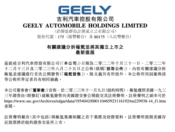 11月10日,吉利汽车(00175)公告称,2023年11月9日,极氪遵照美国一九三三年证券法就极氪发售向美国证交会公开提交其注册声明。