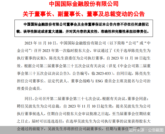 北京商报讯(记者 李海媛)11月10日,中金公司发布公告称,公司董事会同意聘任吴波为公司总裁,即日起起生效;并提名吴波为公司执行董事候选人,任期自公司股东大会审议批准之日起,至当届董事会任期结束之日止,届时可以连选连任。公告还提到,在选举吴波为公司执行董事的议案获得股东大会通过的前提下,吴波亦将担任公司副董事长,任期与董事任期一致。