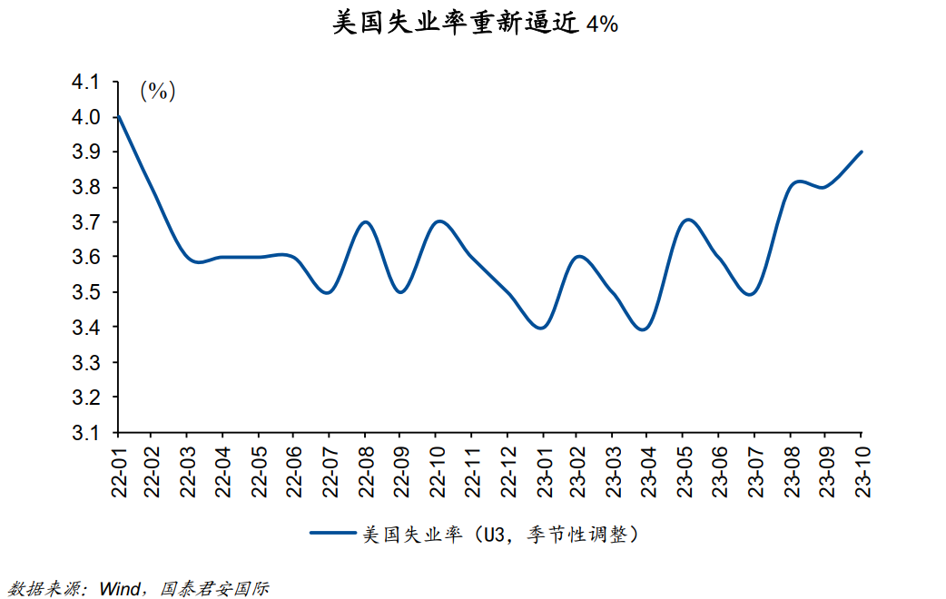 在9月的就业数据中,尽管ADP数据显著弱于市场预期,但由于非农就业数据大超预期,市场并未对ADP和非农数据的差距给予足够的关注,反而开始寻找就业韧性的更多依据。但伴随着10月ADP和非农就业数据同时显著低于市场预期,失业率开始显著上升,加之ISM制造业和服务业数据都显著放缓,美国经济的健康程度重新成为市场的焦点。