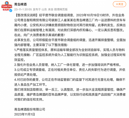 平度市联合调查组发布情况通报后,青岛啤酒发布整改情况说明:经平度市联合调查组调查,2023年10月19日13时许,外包业务公司青岛智和商贸有限公司装卸工人崔某某在青岛啤酒三厂内一运送原料的货车车厢内小便,公安机关以涉嫌故意损毁财物依法对其行政拘留。此事的发生,反映出我们在原料运输管理上有漏洞,对此我们深感内疚和痛心,一定认真反思和整改。在此,向广大消费者表示真诚的歉意!
