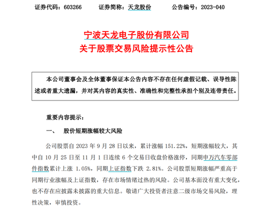就在前一日,天龙股份刚刚提示风险表示,目前公司主要收入来源仍以传统燃油车的汽车零部件为主,新能源汽车业务占比相对较小。