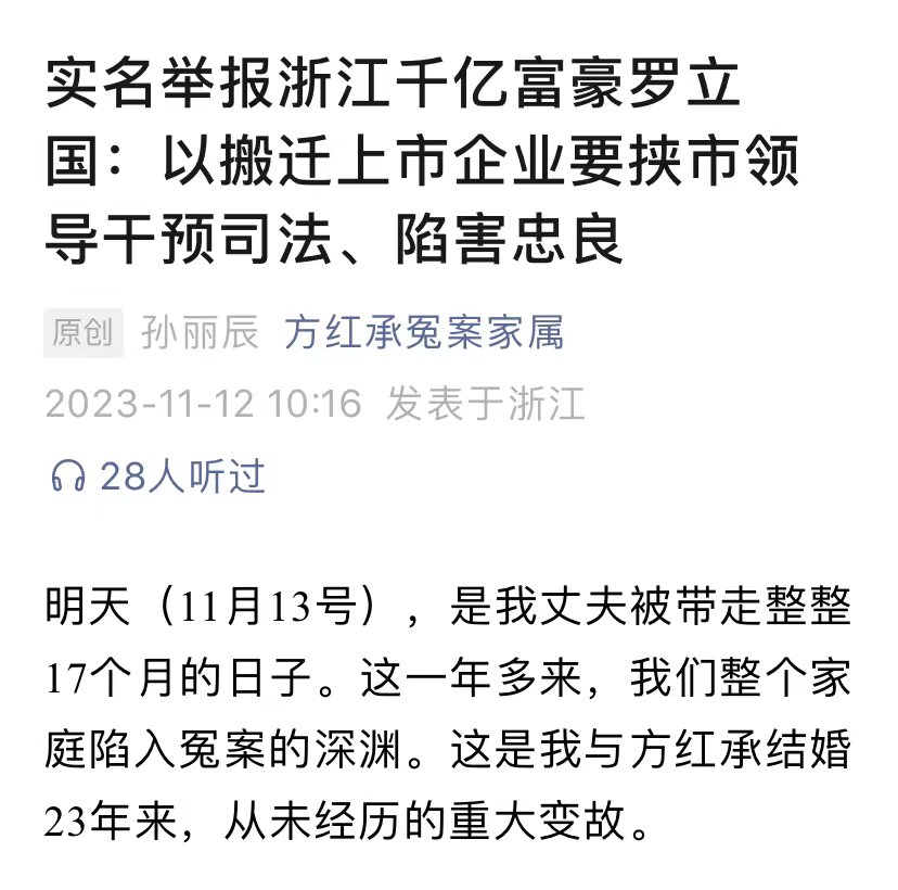 据悉,本次举报内容发布于微信公众号“方红承冤案家属”上,发布人自称是方红承妻子孙丽辰。在整个举报文中,孙丽辰提到三个关键事项:方红承和罗立国存在股权纠纷、罗立国诉方红承职务侵占以及合盛硅业存在安全隐患。