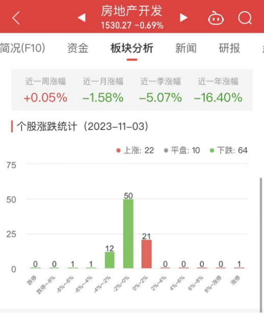 中国经济网北京11月3日讯 今日,房地产开发板块整体涨幅-0.69%,其中22只股票上涨,10只股票平盘,64只股票下跌。