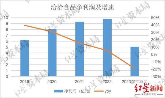 此外,红星资本局注意到,洽洽食品利润也开始大幅下滑。财报显示,今年前三季度企业实现净利润5.06亿元,净利润增速为-19.38%,这是近7年来三季报首次出现净利润下滑的情况。