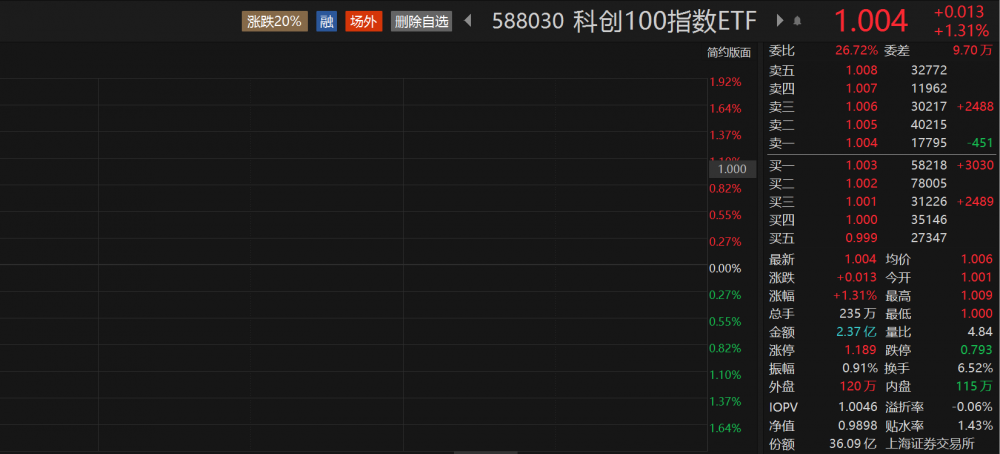 市场上跟踪科创100的ETF中规模最大的科创100指数ETF(588030)涨1.31%,成交额2.37亿元,换手率6.52%。