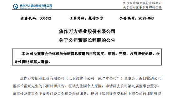 11月1日晚间焦作万方公告,董事会于近日收到公司董事长霍斌的书面辞职报告,霍斌因个人原因,申请辞去公司第九届董事会董事、董事长及董事会下设专门委员会相关委员职务。根据相关规定,霍斌的辞职报告自送达公司董事会之日起生效。辞职后,霍斌不在公司及子公司担任任何职务。