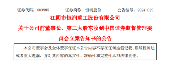 恒润股份(603985)4月30日晚间公告,公司前董事长、第二大股东承立新收到中国证监会签发的《立案告知书》,因其涉嫌操纵市场、内幕信息交易,中国证监会决定对其立案。
