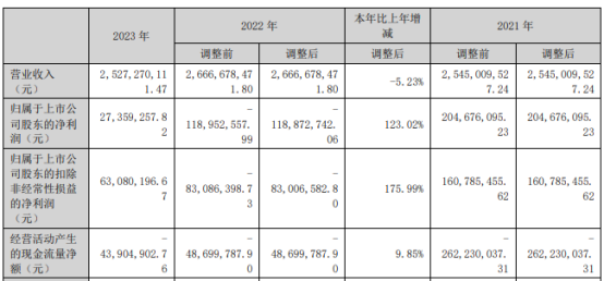 挖贝网4月27日,天宇股份 近日发布2023年年度报告,报告期内公司实现营业收入2,527,270,111.47元,同比下滑5.23%;归属于上市公司股东的净利润27,359,257.82元,较上年同期扭亏为盈。