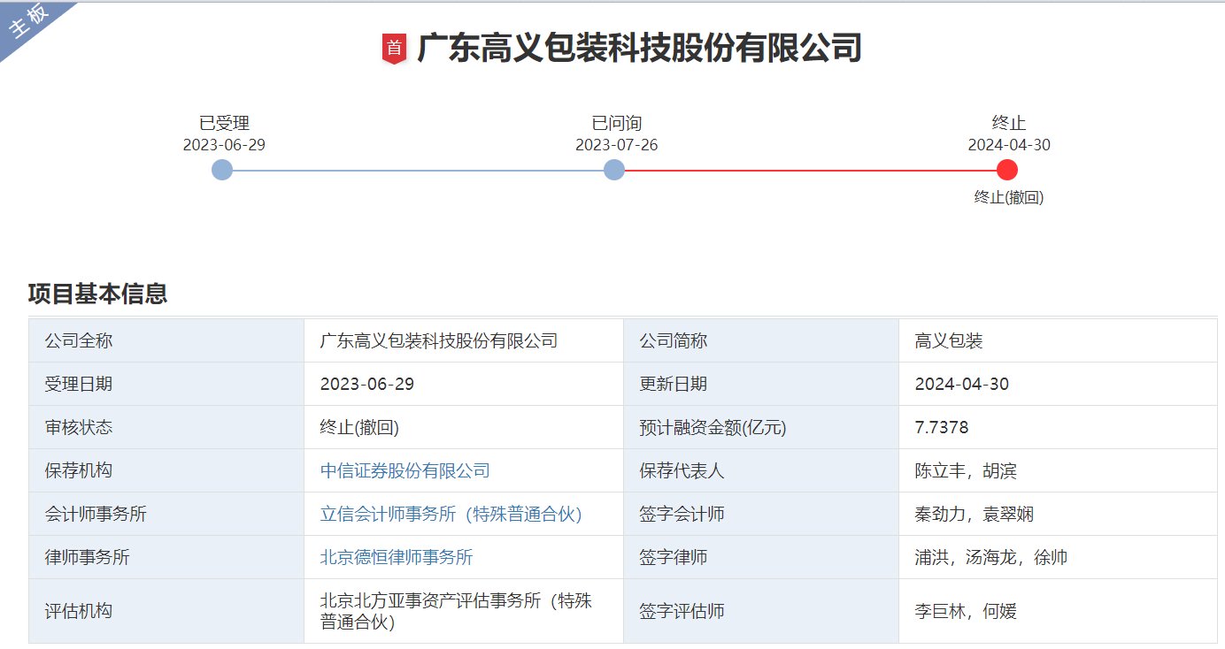 高义包装深交所IPO终止,中信证券保荐