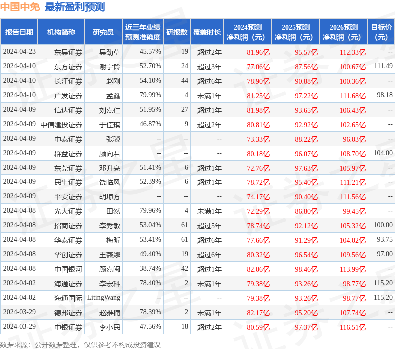 证券之星数据中心根据近三年发布的研报数据计算,广发证券孟鑫研究员团队对该股研究较为深入,近三年预测准确度均值为79.99%,其预测2024年度归属净利润为盈利81.25亿,根据现价换算的预测PE为18.25。