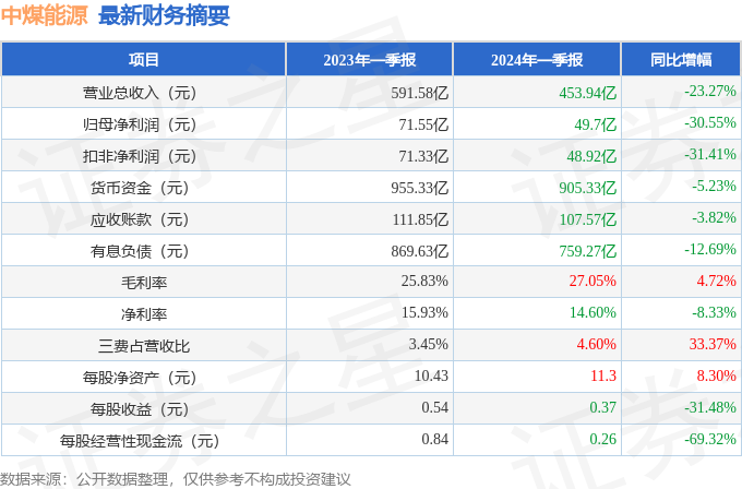 据证券之星公开数据整理,近期中煤能源(601898)发布2024年一季报。根据财报显示,本报告期中中煤能源净利润减30.55%,三费占比上升明显。截至本报告期末,公司营业总收入453.94亿元,同比下降23.27%,归母净利润49.7亿元,同比下降30.55%。按单季度数据看,第一季度营业总收入453.94亿元,同比下降23.27%,第一季度归母净利润49.7亿元,同比下降30.55%。