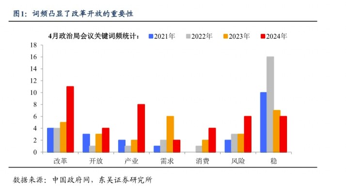 短期内经济政策明显加量提质,为三中全会召开保驾护航。今年4月政治局会议对于经济内容的强调和描述可能是近10年份量第二大的一次(仅次于2020年同期),而高层重视的重要原因可能在于吸取了前几年的经验,为7月三中的召开创造积极“光明”的宏观环境:疫情之后的我国经济呈现的特点是追求开门红后,往往会在第二季度出现放缓的压力。