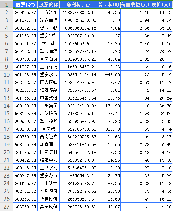 长安汽车以113.27亿元列净利润总额第一,基本每股收益第一为智飞生物3.36元,净利润同比增长率第一系重庆港339.70%。