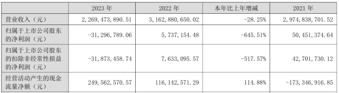 挖贝网4月26日,保立佳 近日发布2023年年度报告,报告期内公司实现营业收入2,269,473,890.51元,同比下滑28.25%;归属于上市公司股东的净利润-31,296,789.06元,较上年同期由盈转亏。