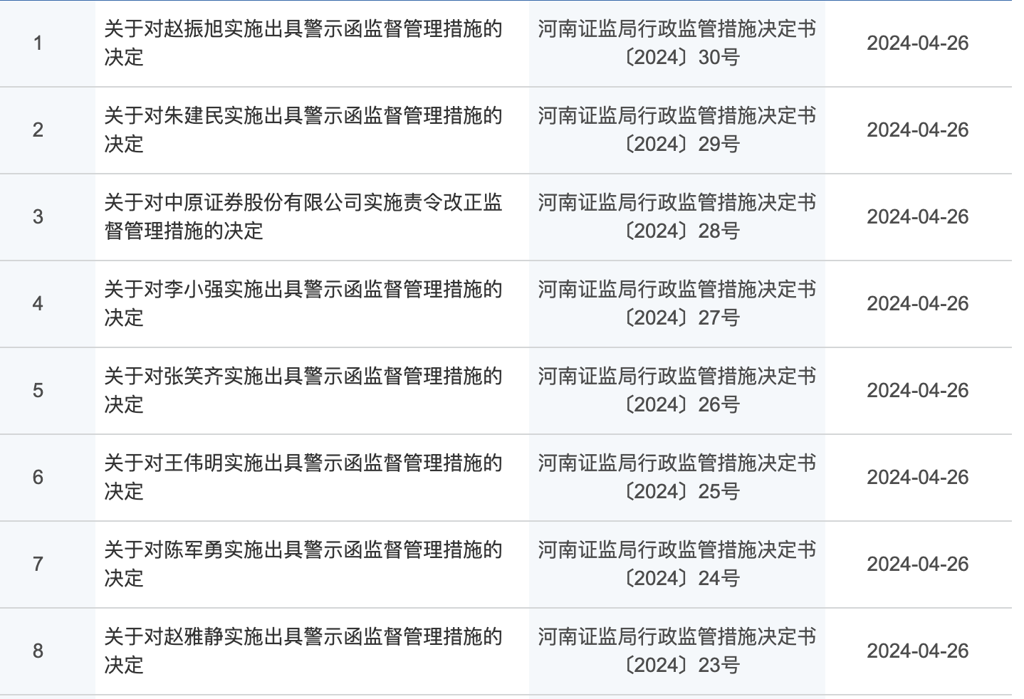 4月26日,河南证监局发布《关于对中原证券股份有限公司实施责令改正监督管理措施的决定》。因存在合规管理和风险管理不到位等多项不符合规定情形,河南证监局决定对中原证券实施责令改正的监督管理措施;就上述违规行为,河南证监局同步向中原证券7名相关工作人员实施出具警示函的监督管理措施。