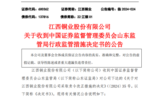 4月26日晚间,江西铜业发布公告,公司因未完成在收购恒邦股份时作出的避免同业竞争承诺,被山东证监局采取责令改正的行政监管措施,并记入证券期货市场诚信档案数据库。