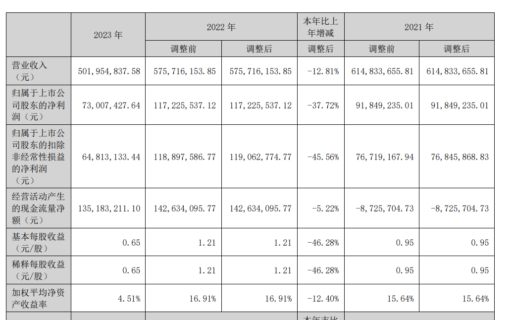 2023年,致尚科技营业收入5.02亿元,同比减少12.81%;归属于上市公司股东的净利润约7301万元,同比减少37.72%。