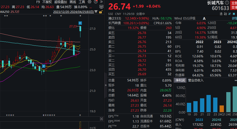 今天上午,A股市场整体上行,多数个股上涨,千亿市值汽车龙头之一的长城汽车盘中罕见涨停。